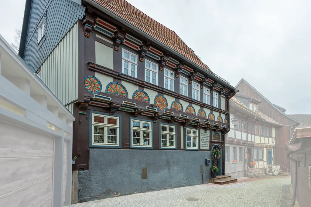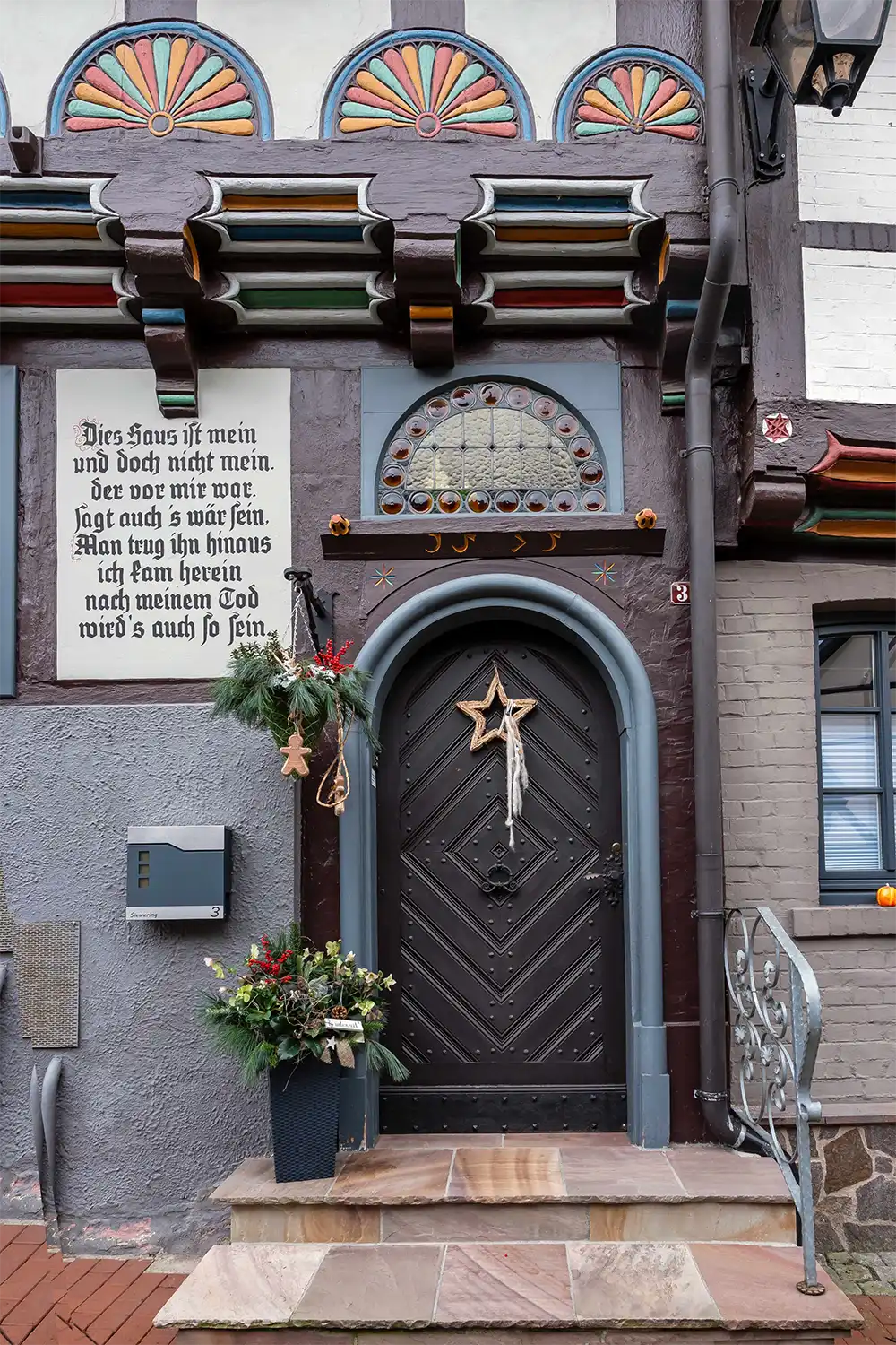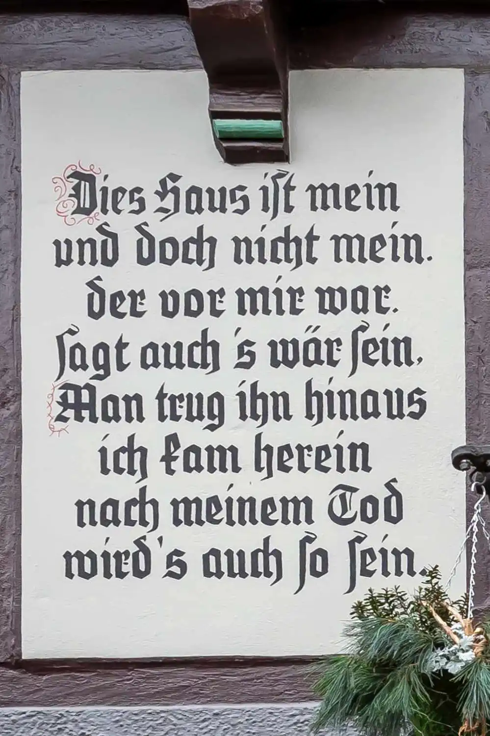 Augenfällig ist neben dem prächtigen Schmuck auch der Hausspruch: „Dies Haus ist mein und doch nicht mein. Der vor mir war, sagt auch es wär sein. Man trug ihn hinaus, ich kam herein. Nach meinem Tod wird’s auch so sein.“ Er stammt aus dem 19. Jahrhundert und wurde den Besitzern zur Silbernen Hochzeit geschenkt.