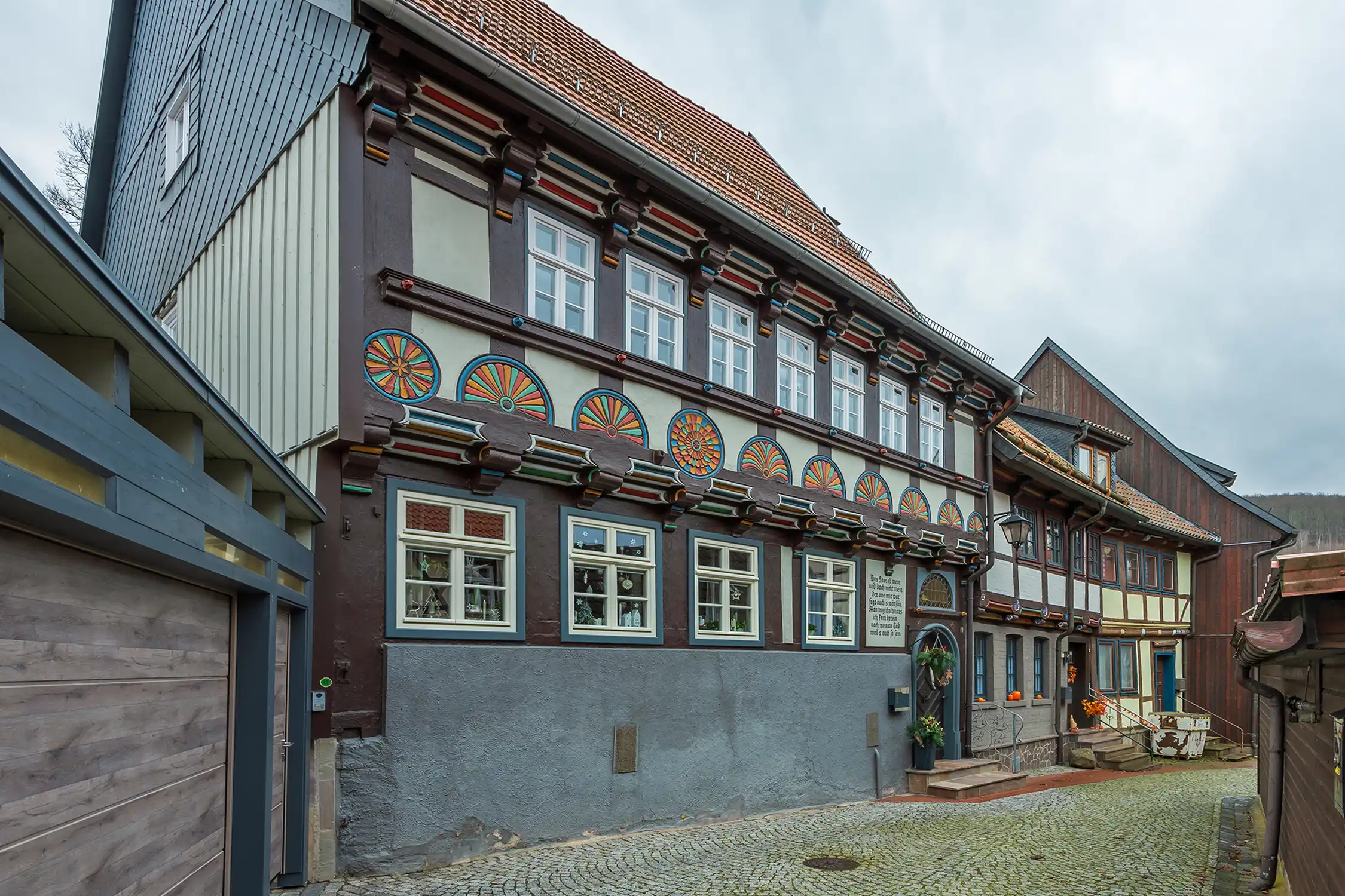 Das heutige Gebäude wurde ursprünglich 1535 von der Familie Schneidewein errichtet. Zwei Jahrhunderte später fiel es jedoch teilweise einem Brand zum Opfer. Im Stil der Renaissance wieder neu aufgebaut, fügt es sich mit reichem, farbenfrohem Schnitzwerk in das historische Stadtbild. Seine Vorderfront zeigt acht halbe Fächerrosetten und -palmetten und, als Besonderheit, zwei prachtvolle Vollrosetten, die in Stolberg einmalig sind. Doppelte Schiffskehlen und an den Seiten verzierte Zylinder-Balkenköpfe runden das Renaissance-Fachwerk ab.